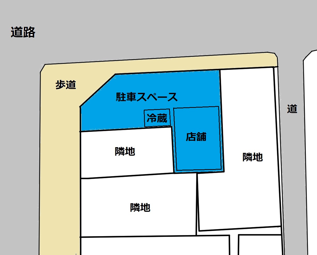 駐車可能台数8台、業務用冷蔵庫完備の二階建ての広々とした物件です。一階店舗部分にリフトがあり、二階は倉庫としてもご利用いただけます。